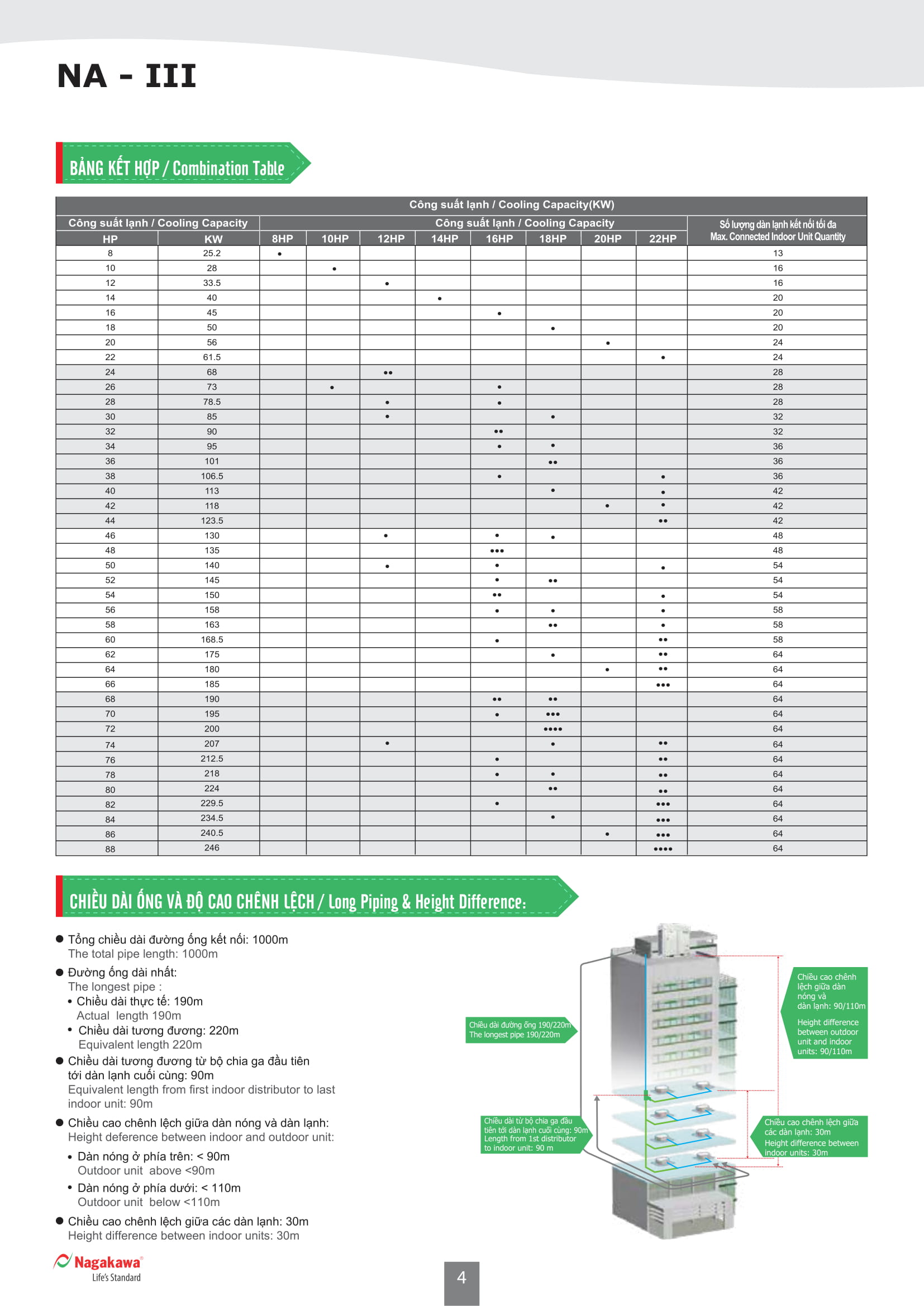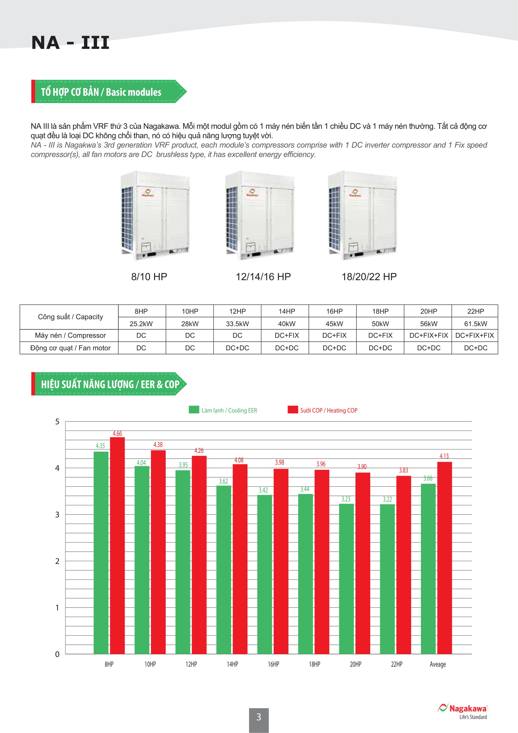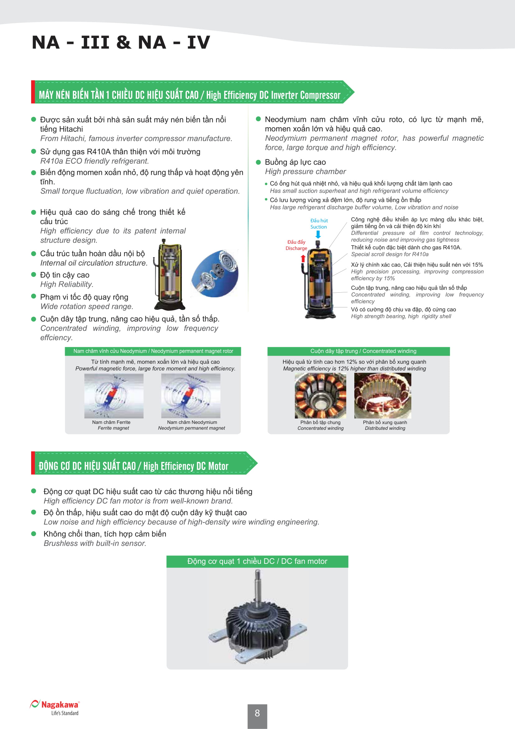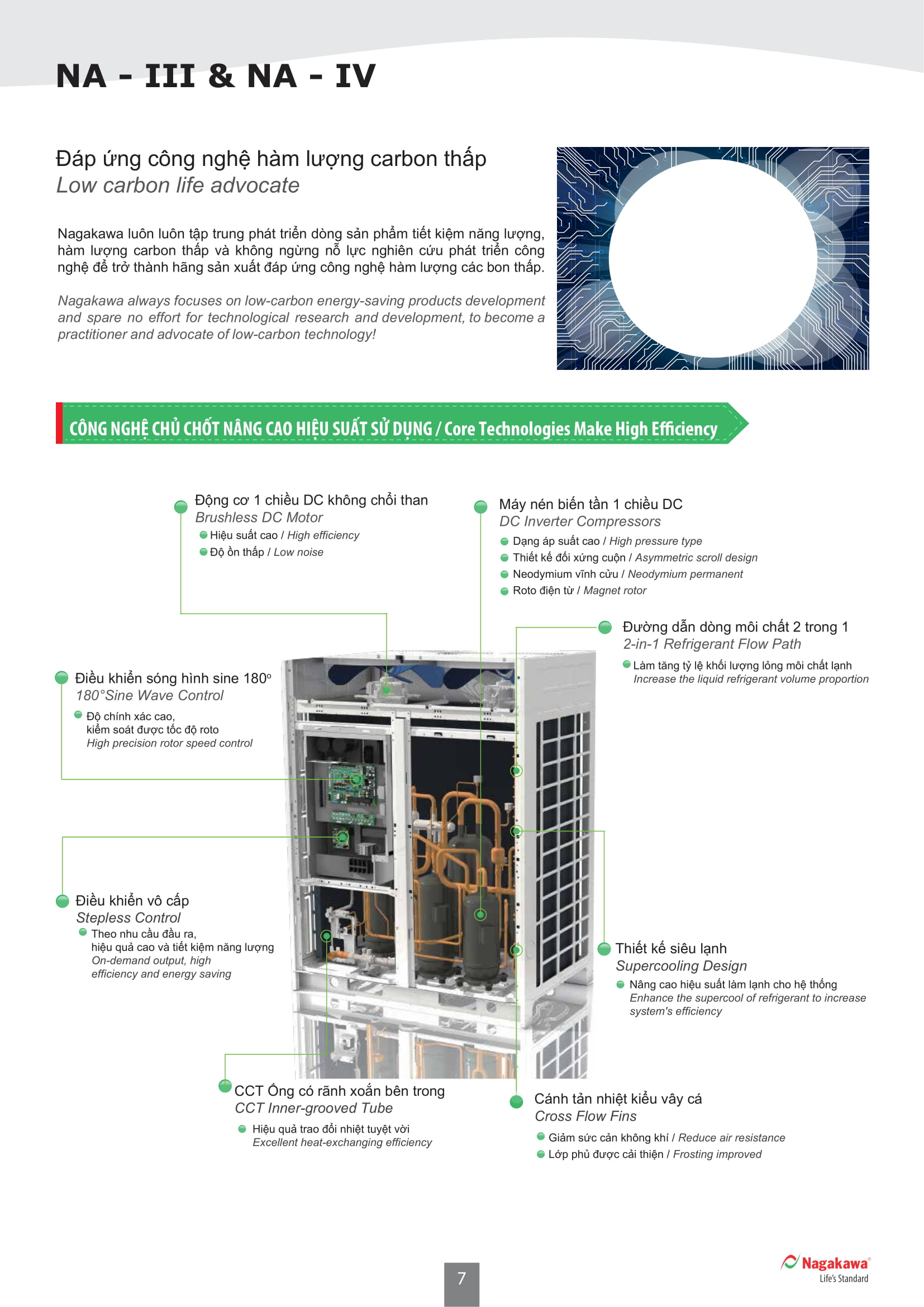 Điều hòa thương mại Nagakawa NA – III dòng sản phẩm tiết kiệm năng lượng, không ngừng nỗ lực nghiên cứu phát triển công nghệ để trở thành hãng sản xuất đáp ứng công nghệ hàm lượng carbon thấp, thân thiện với môi trường. Động cơ DC hiệu suất cao từ các thương hiệu nổi tiếng Ống đồng có rãnh xoắn bên trong điều hòa thương mại Nagakawa NA – III có độ khuếch tán cao, tăng cường sự xáo trộn môi chất lạnh để tăng hiệu suất trao đổi nhiệt. Nhiệt độ chế độ làm lạnh lên đến 54 độ C thích hợp cho vùng nóng, và nhiệt độ hoạt động chiều sưởi xuống tới - 20 độ C. Vào mùa đông, hệ thống của điều hòa thương mại Nagakawa NA – III có thể sinh nhiệt. Độ ồn với 7 cải tiến làm giảm tiếng ồn: Động cơ DC không chổi than Hoạt động chế độ im lặng và kiểm soát vào ban đêm Máy nén có độ ồn thấp Điều khiển dạng sóng hình sin 180 độ Thiết kế ống dẫn luồng không khí Khử độ rung của cánh quạt Mạch giảm âm thanh Chức năng điều khiển dàn nóng của điều hòa thương mại Nagakawa NA – III khi có một tín hiệu liên kết báo động cháy. Khi gặp tình huống khẩn cấp có thể dừng lại toàn bộ hệ thống AC